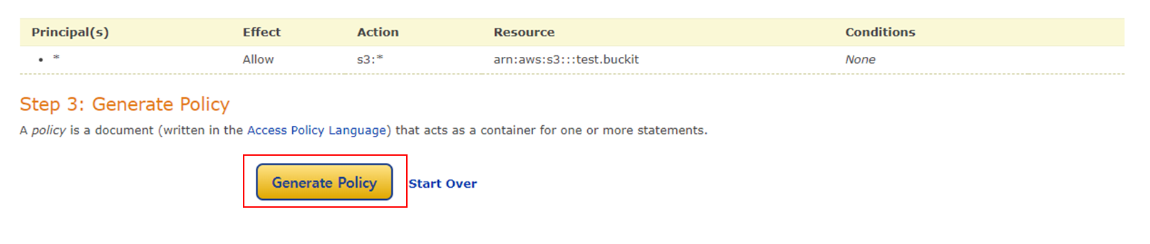 - AWS 정책을 추가하면 밑에 정책 정보가 나온다. Generate Policy를 클릭하면 JSon 문서가 나오는데, 안에 있는 내용을 복사해서 버킷 챙책 밑에 붙어넣고 저장한다.