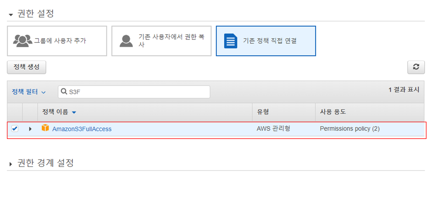 - 권한 설정에서 기존 정책 직접 연결들어가서 AmazonS3FullAccess 를 체크한다.