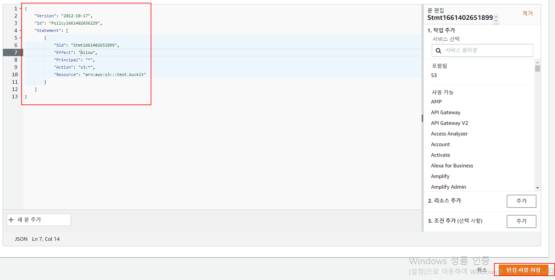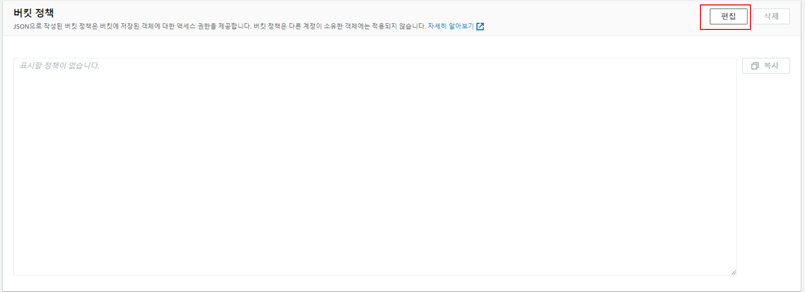 - 생성한 버킷에 들어가서 권한 > 정책 편집기 > 편집을 누른다.