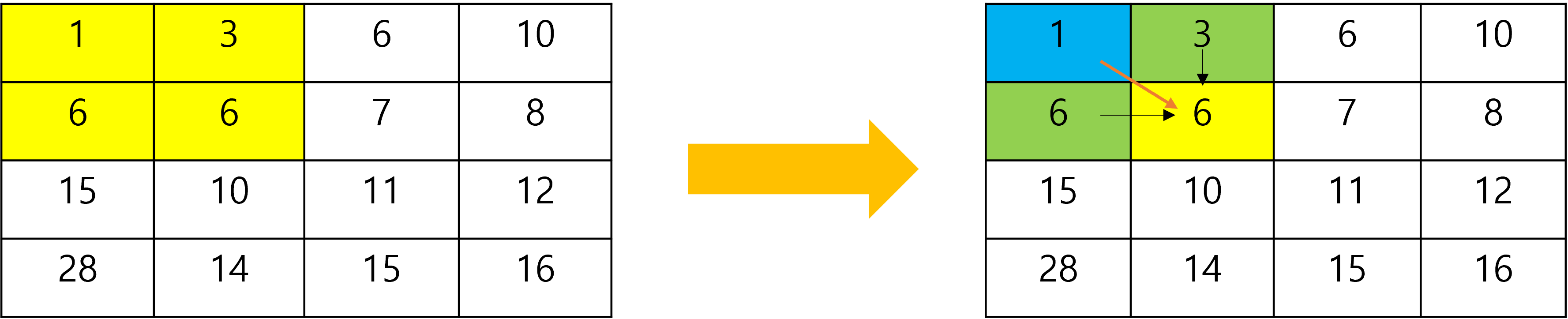 왼쪽 그림은 1번째 행열 누적합 연산한 결과이다. 예시로 (2, 2)를 예제로 하겠다. 기존 계산 방법으로 (2, 2) 누적 합은 1 + 2 + 5 + 6 = 14이다. 기존 누적 합으로 위 아래만 계산하면 3 + 6 + 6 = 15가 나온다. 계산이 잘못 된 이유는 이전 왼쪽과 위이전 쪽이랑 공통된 부분까지 연산해서 생긴 결과이다. 그래서 공통된 부분을 제거를 해야한다. 공통된 부분을 제거할 부분은 (1, 1) 다신 연산을 하면 3 + 6 + 6 - 1 = 14가 나온다.